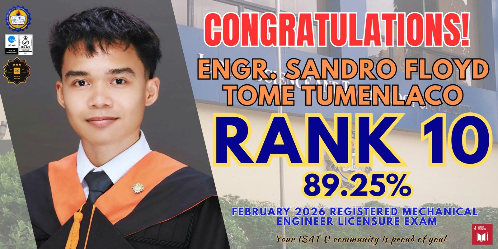 The Iloilo Science and Technology University (ISAT U) community is beaming with pride as one of its own, Engr. Sandro Floyd Tome Tumenlaco, secured a