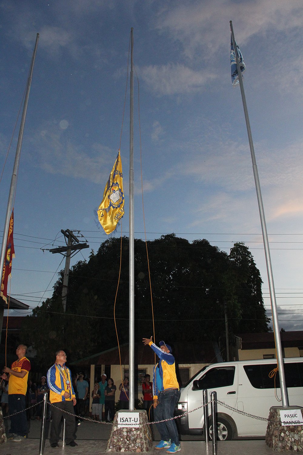 - Dr. Raul F. Muyong and Dr. Leomar de los Santos hoist the school banner during the opening ceremony.