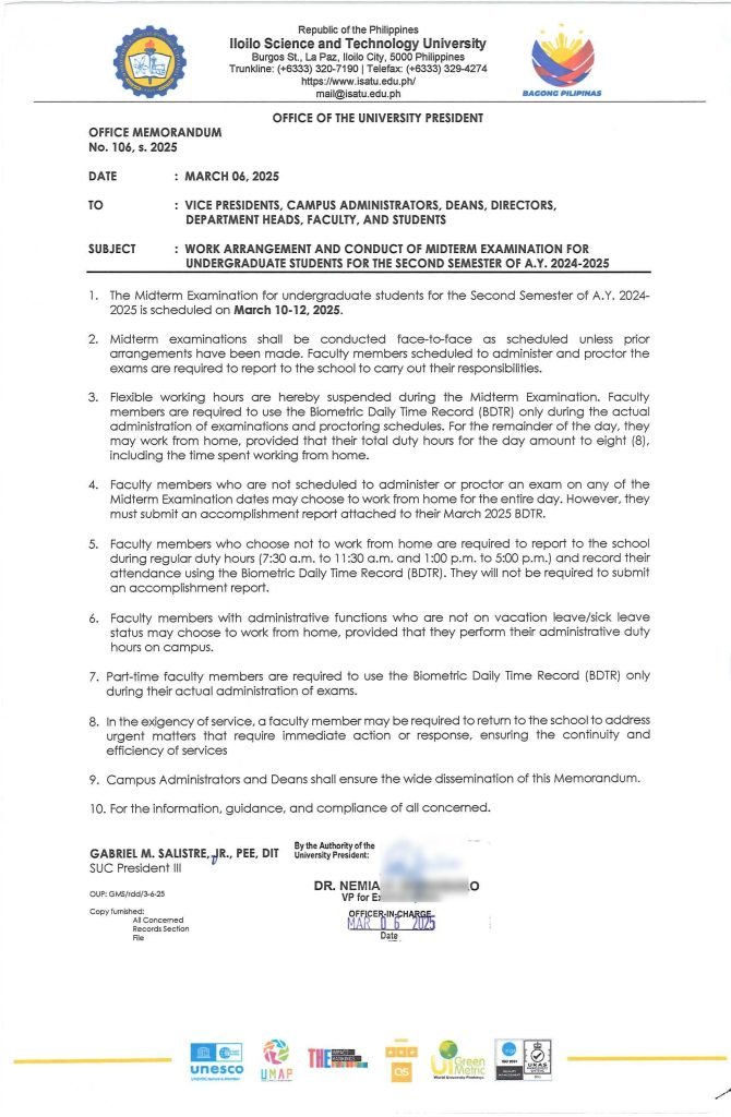 Office Memorandum No. 106, s. 2025 – Work arrangement and conduct of midterm examination for undergraduate students for the second semester of A.Y. 2024-2025