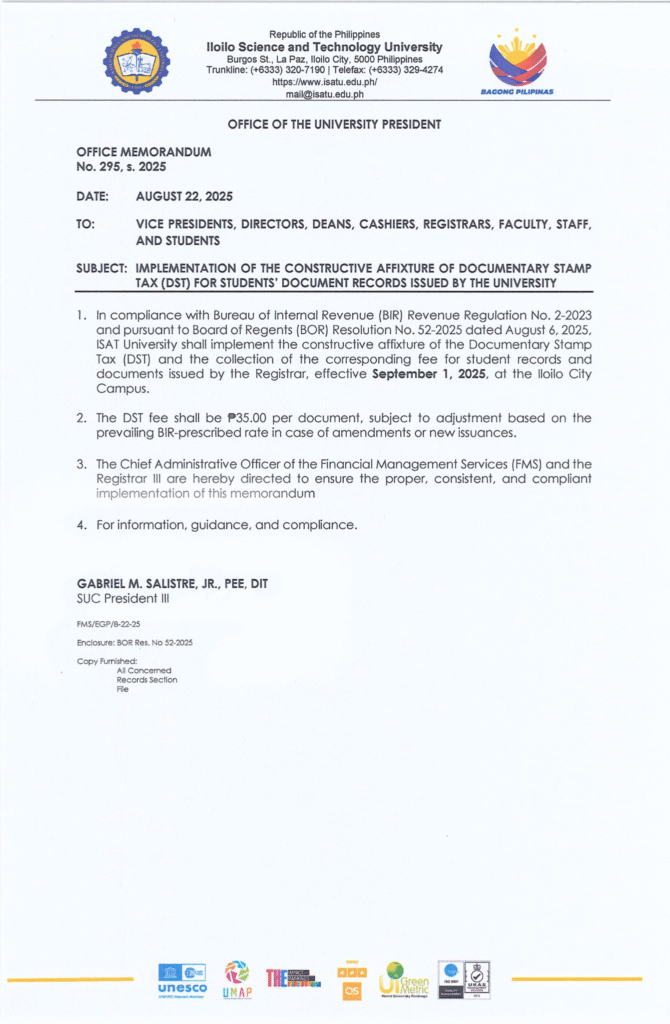 OFFICE MEMORANDUM NO. 295, S. 2025 Implementation of the Constructive Affixture of Documentary Stamp Tax (DST) for Students’ Document Records issued by the University
